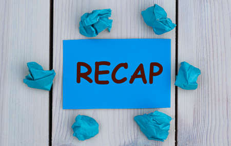RECAP - word on blue paper on a light background with crumpled pieces of paper