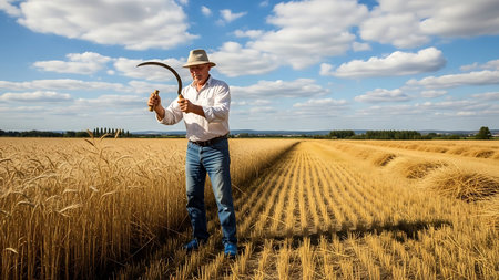 Man in a hat holding a scythe in a wheat field on a sunny day.