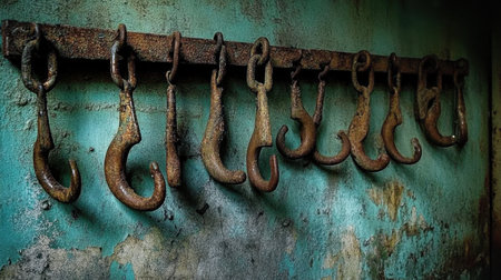 This image captures a row of rusty metal hooks hanging on a deteriorating wall, showcasing intricate textures and a moody ambiance typical of industrial settings.