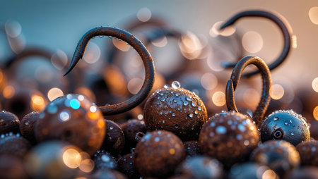 Close-Up View of Metal Hooks Covered in Water Droplets with Colorful Bokeh Effect in Soft Lighting