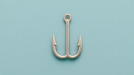 Close-up of a silver fishing hook against a soft blue background, illustrating high-quality craftsmanship and appealing design. Ideal for fishing enthusiasts and themed projects.