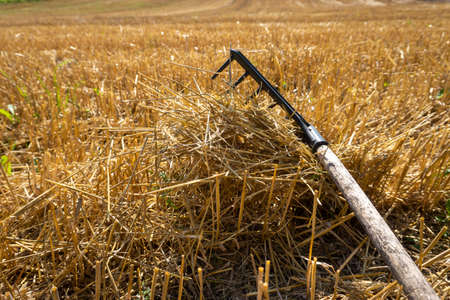 Rustic rake in a harvested field of wheat with stalk stubble in an agricultural landscape
