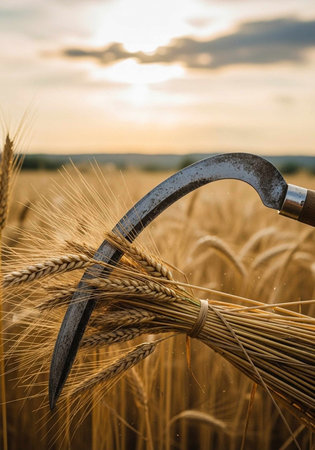 A close-up of a rustic sickle amidst tall, golden wheat stalks in a field at sunset.
