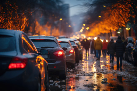 Busy street in city with traffic jam, created using generative ai technology. Busy city, car, traffic, digitally generated image.