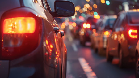 Cars lined up in traffic with glowing taillights, creating a colorful, blurry effect during dusk in the city streets.