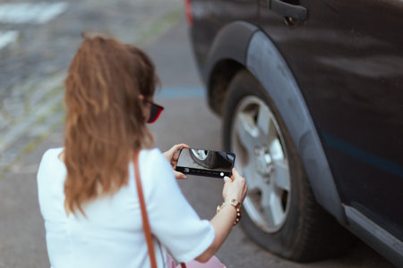 Outdoor shot of an unrecongnizable caucasian woman taking a photo on a road of her cars front fender with a modern smartphone. High quality photo