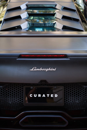 Miami, Florida USA - February 20, 2022: Close up view of the rear of a exotic Italian Pagani Huayra Roadster supercar on display at the public Miami Concours car show in the upscale Design District.