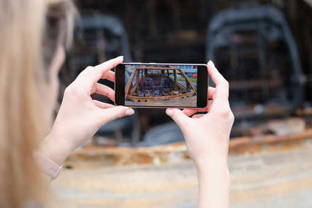 Close up hand of woman holding smartphone and take photo of car accident