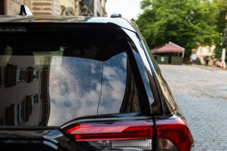 Back window of black car parked on the street in summer sunny day, rear view. Mock-up for sticker or decals