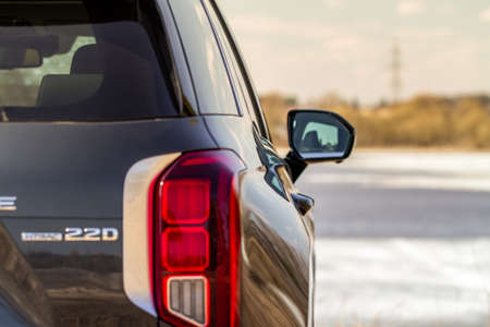 Riga, Latvia, April 29, 2022: LED rear lights and car design closeup of nev Hyundai Santa Fe crossover, model 2022