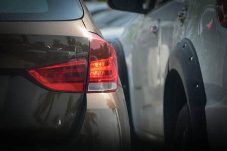 red tail light of brown car in large asphalt parking lot, transportation industry