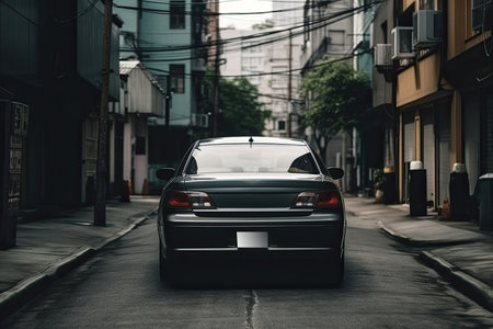 Rear side of gray car on the asphalt road heading towards the goal of the trip. Traveling for work during rush hour. Environment blurred of other cars in the city. Island of green
