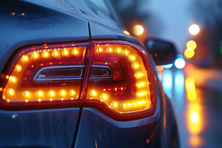 Close-up of contemporary car tail lights, displaying intricate design and illumination, emphasizing modern automotive technology and craftsmanship in vehicle aesthetics