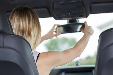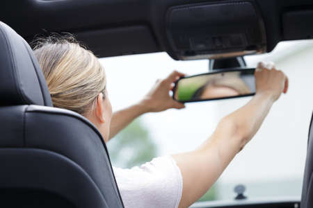 woman driving adjusting rear view mirror