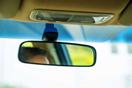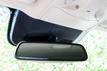 Closeup of rear view mirror in modern car interior