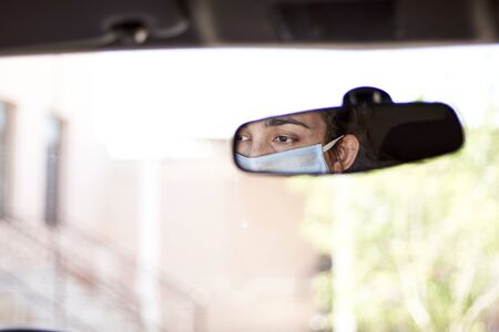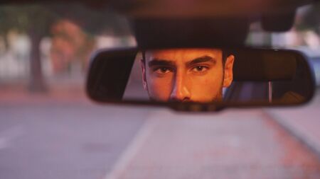 Reflection of young man in side view mirror of car. Concept of Transportation