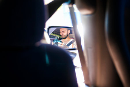 Driver in rearview mirror Rear view of attractive young woman in casual wear looking in rearview mirror and smiling while driving a car : Generative AI