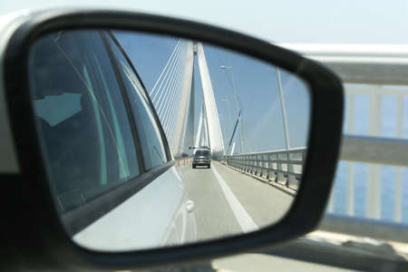 View from the car to the road through the rearview mirror.