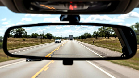 rear view mirror in rural landscape