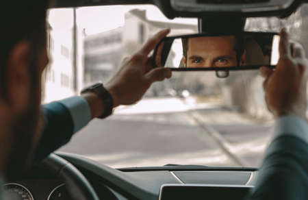 Adorable businessman is adjusting image reflection in the car