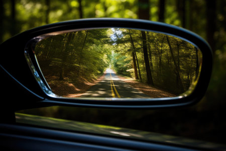 car mirror with trees and road background