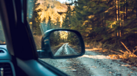 Reflection in the side mirror of a car on the road in autumn forest
