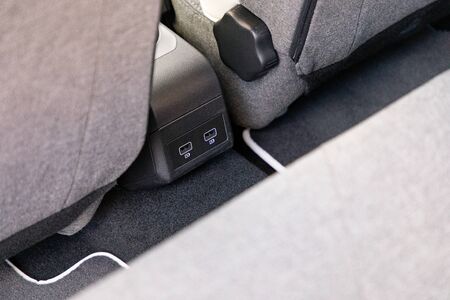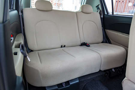 Close-up on rear seats with velours fabric upholstery in the interior of an Japan car in beige after dry cleaning with nano floor mat carpets. Auto service industry.