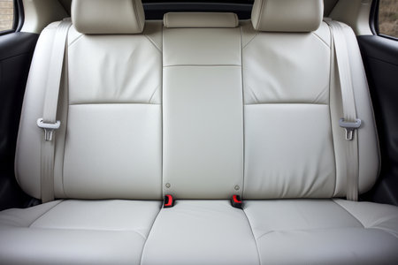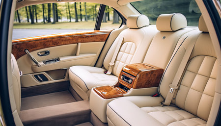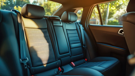 Stunning image of a luxurious leather car interior, showcasing the backseat with warm sunlight enhancing the sleek design and inviting comfort of the space.