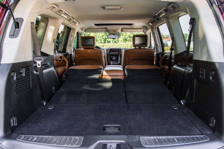 Huge, clean and empty car trunk in interior of compact suv. Rear view of a SUV car with open trunk