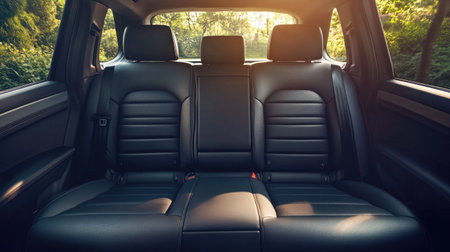 Discover the inviting and spacious backseat of a leather car interior, illuminated by soft natural light and surrounded by lush greenery, perfect for joyful journeys.