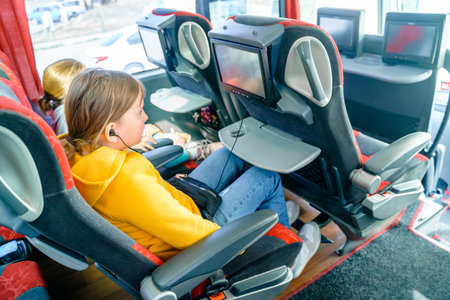 Bus road traveling. Girl kid rides on large comfortable sightseeing excursion bus. Watching movie cartoon on screen in chair. entertainment media system. Sittting, listening to music in headphones.