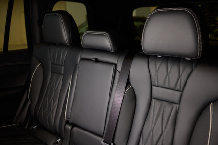 Back passenger seats in modern luxury car, frontal view. Black perforated leather with white stitching. Car detailing. Leather comfortable black seats. Car interior details