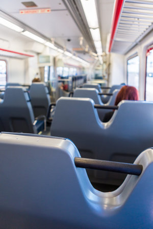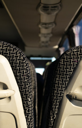 Bus interior, selected focus on seat. Transport, traveling and tourism concept.