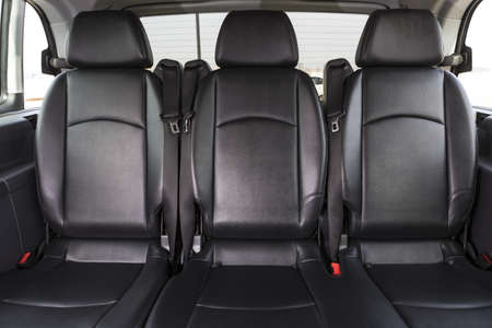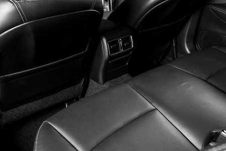 Closeup of a modern car interior with the black leather rear seats
