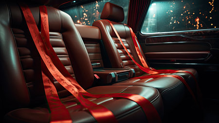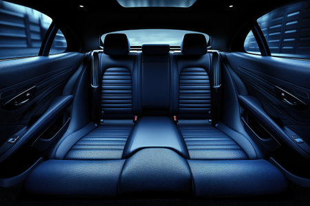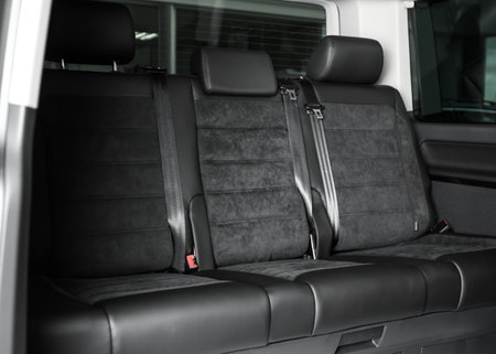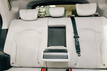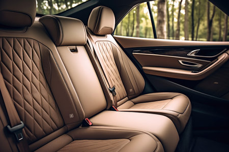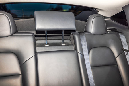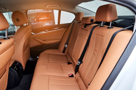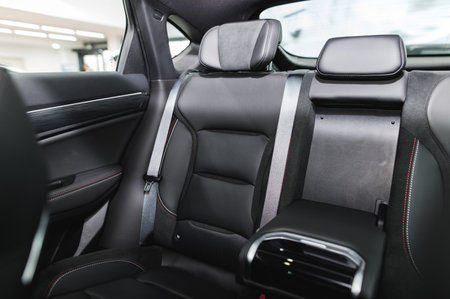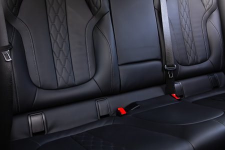 Dark luxury new car Interior. Back passenger seats in modern car. Leather backseats and seatbelts