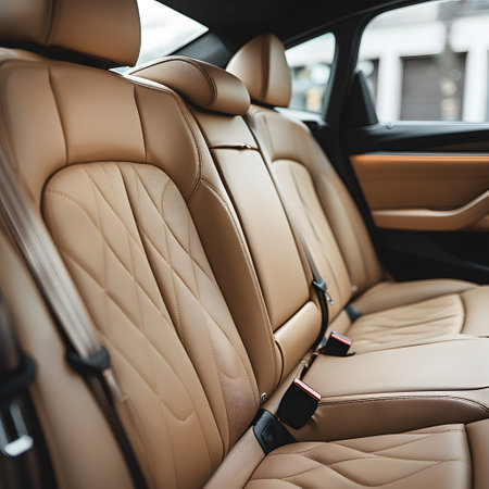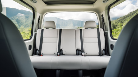 Rear leather seats car with headrests and seat belts inside showcasing modern design and comfort.