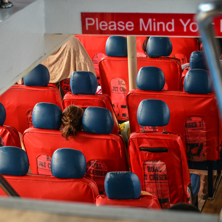 Phuket, Thailand - Apr 27, 2018. Seats row inside ferry boat on the sea in Phuket, Thailand.