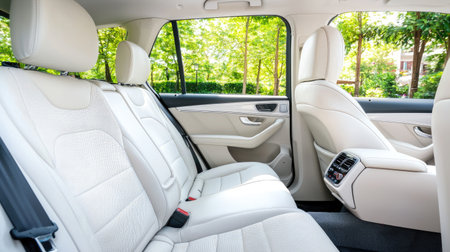 Back passenger seats in modern luxury car, side view, white leather