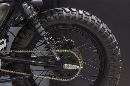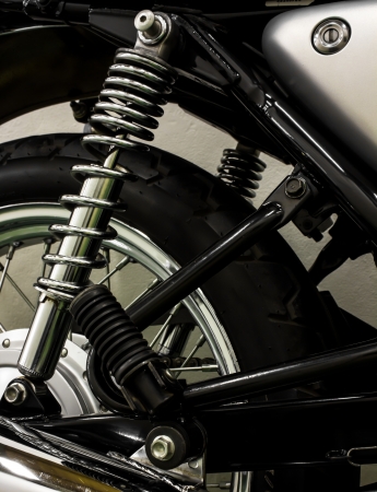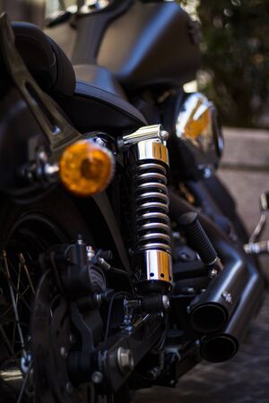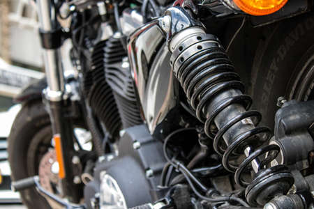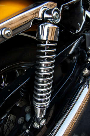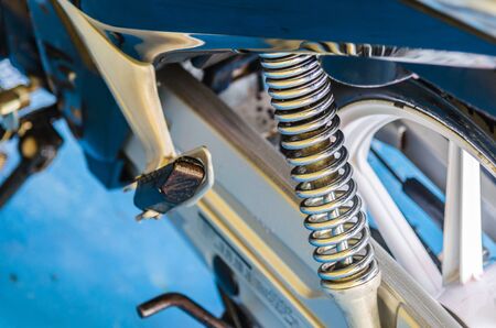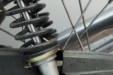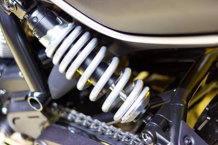 Motorcycle spring and shock absorber close-up. Motorcycle vibration system.