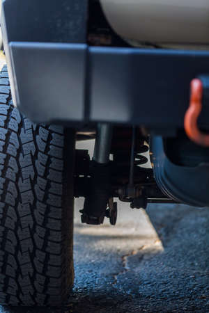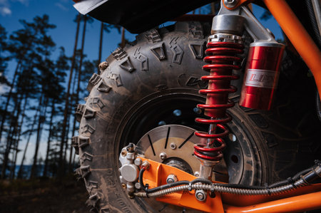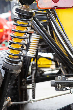 Close up shot of an all terrain vehicle suspension.