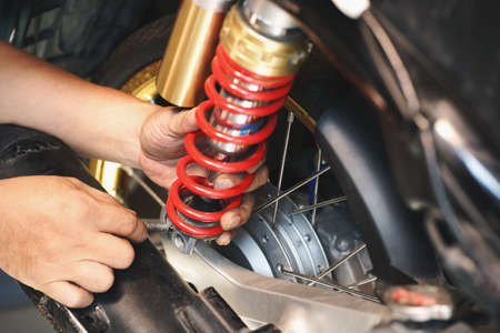 motorcycle mechanic check and Change rear Shock Absorbers motorcycle at motorcycle garage, repair, maintenance and service concept