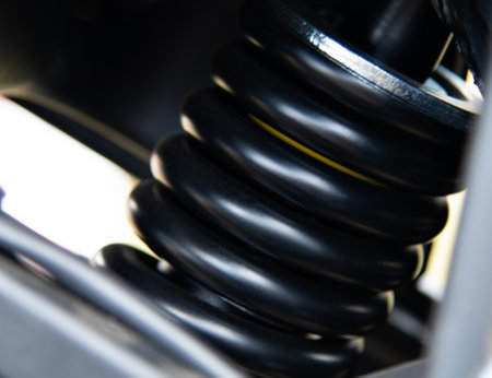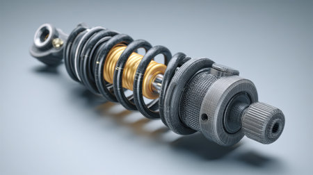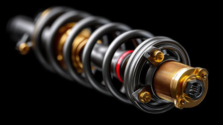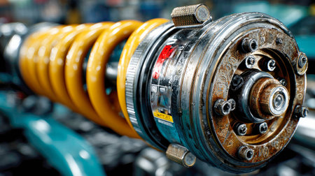 This detailed macro shot showcases a mechanical shock absorber with springs and intricate components, ideal for automotive applications. The image highlights precision engineering and design, suitable for technical analysis or marketing materials.