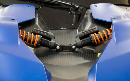 Futuristic car suspension closeup in blue golden glow.
