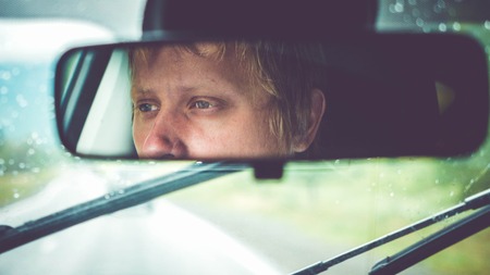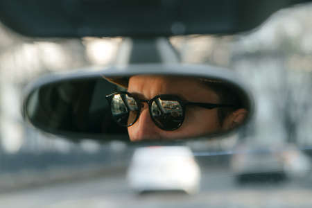 Man looking in the rear view mirror while driving the car, focus to the mirror with just his eyes visible