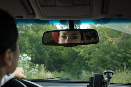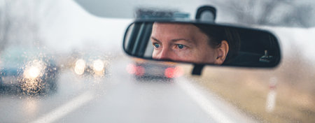 Female driver face at car rear view mirror on a rainy day, selective focus