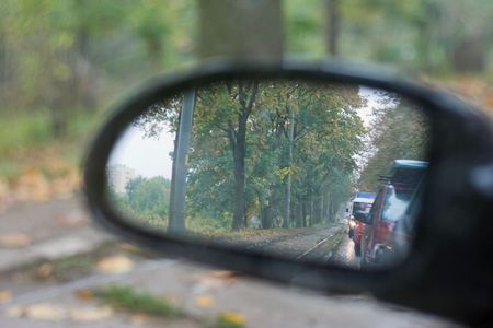 Car rearview mirror. Mirror for viewing the blind spot on the road. Reflection in the side mirror.