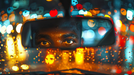 Driver's Perspective on a Rainy Night: Colorful Reflections in the Rearview Mirror.
