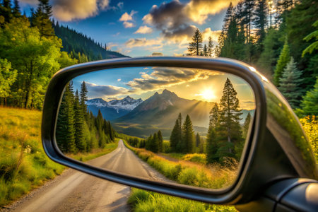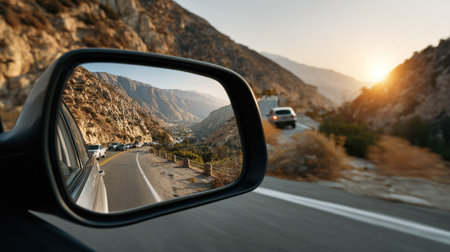 A captivating image showcasing a car's side mirror reflecting a winding mountain road with a stunning sunset backdrop, evoking a sense of adventure and exploration.