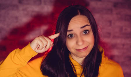 Portrait of young woman twirling finger at her temple. Close up of perplexed female twisting index finger at temple