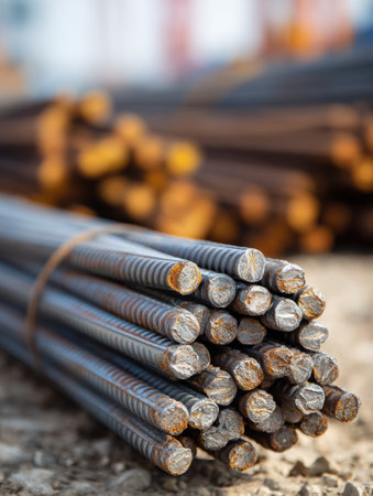 Steel rebar bundle lies on the ground, showing its strong, textured surface against a soft-focus backdrop of construction activity in the area.